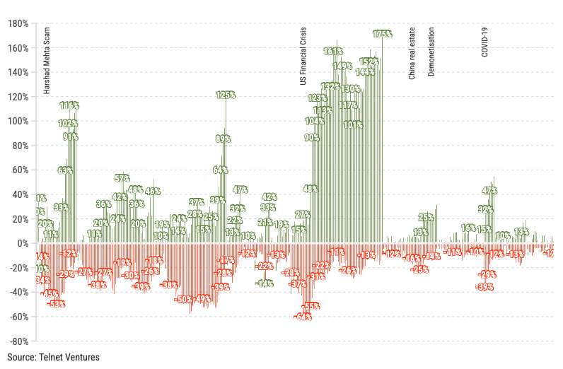 During the 2008 financial crisis, the peak drawdown was 63%, meaning the average investor lost ~63% of their wealth compared to the previous peak. The losses of the Harshad Mehta scam of 1992 and the Dot-com crash of 2001 were in their 50s, while the recent Covid crash was 40%.