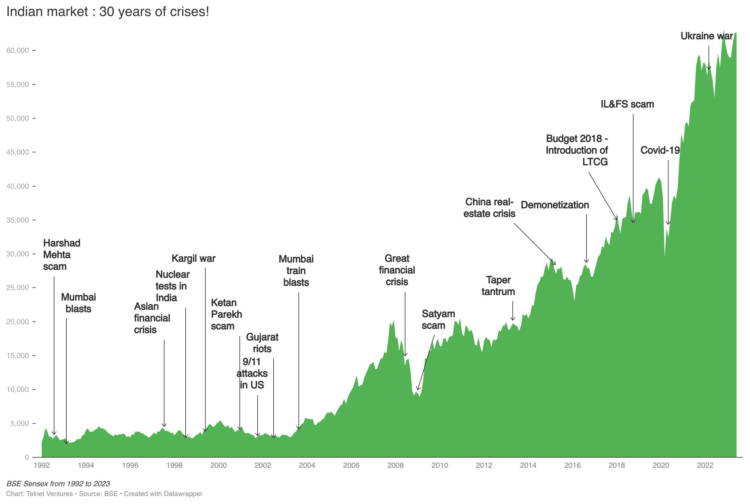 The chart below lists all the major crises of the last 30 years. Pick your favorite crisis. Demonetisation? Covid? Remember how dreadful it felt while it was happening? But look at what has happened to the markets subsequently.